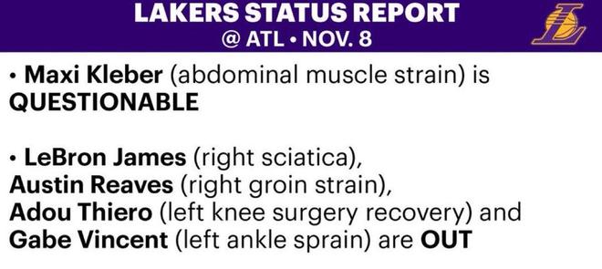 北京时间今日,洛杉矶湖人队更新了伤病名单,球队主力后卫奥斯汀-里夫斯的伤情由此前右腹股沟酸痛变为右腹股沟拉伤,他将会缺席明日湖人客战老鹰的比赛。此外,加盟湖人后尚未上演首秀的克勒贝尔出战成疑。